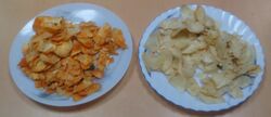 In Nagaland and Mizoram in Northeast India, tapioca is eaten as a snack. It is usually boiled with a bit of salt in water after skinning it, or snacks are made by drying the tapioca after cutting it. It is then powdered into flour and turned into dough to either make a fired or baked biscuit. In their local dialect, they call it kuri aloo, meaning "wood potato." All groups of society eat these chips as a delicacy. The skin of the tapioca, which is not edible for humans, is kept aside to prepare food for domesticated pigs.