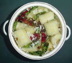 Tapioca is widely consumed across Kerala. It is taken as breakfast or as a staple food. It is boiled (after skinning and cutting it into large pieces of about 6–8 cm (2.4–3.1 in) long or into small 2 cm (0.79 in) cubes) in water till adequately cooked, and the water is drained off. Once cooked, it can be mixed with grated coconut, chili, salt, turmeric, etc., then steamed and mashed into a dry pudding. If desired, this can be garnished with oil with mustard, onion, curry leaves, etc. Tapioca pieces (chendan kappa) are often eaten with simple chili sauce (a paste of green/red chili, shallots, garlic, salt, and oil).