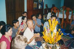 All Tai people believe Khwan as the element of vitality and longevity.[6] It is the belief system features thirty-two typically protective khwan in various parts of the body.[7] Khwan is a Tai word with various linguistical tones such as khwan by Tai-Ahom, Tai Yai (Shan), Dai, Thai-Lao(ຂວັນ, ขวัญ) and Tai-Lue, Xen or Xwan by White Tai, khuan by Tai-Nùng and Tày, hon by Dioi.[8] Various rituals are performed by various Tai groups to worship the Khwan.