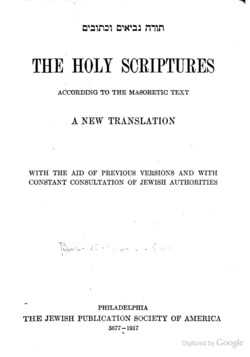 The Jewish Publication Society of America Version (JPS) of the Tanakh (the Hebrew Bible) was the first Bible translation published by the Jewish Publication Society of America and the first translation of the Tanakh into English by a committee of Jews (though there had been earlier solo efforts, such as that of Isaac Leeser).[1] The full publication title is The Holy Scriptures According to the Masoretic Text: A New Translation with the Aid of Previous Versions and with Constant Consultation of Jewish Authorities.