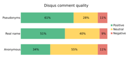 The social cost of cheaply discarded pseudonyms is that experienced users lose confidence in new users,[49] and may subject new users to abuse until they establish a good reputation.[46] System operators may need to remind experienced users that most newcomers are well-intentioned (see, for example, Wikipedia's policy about biting newcomers). Concerns have also been expressed about sock puppets exhausting the supply of easily remembered usernames. In addition a recent research paper demonstrated that people behave in a potentially more aggressive manner when using pseudonyms/nicknames (due to the online disinhibition effect) as opposed to being completely anonymous.[50][51] In contrast, research by the blog comment hosting service Disqus found pseudonymous users contributed the "highest quantity and quality of comments", where "quality" is based on an aggregate of likes, replies, flags, spam reports, and comment deletions,[47][48] and found that users trusted pseudonyms and real names equally.[52]