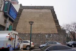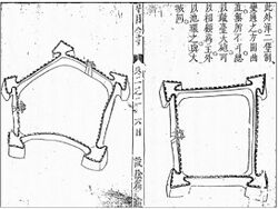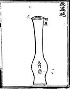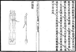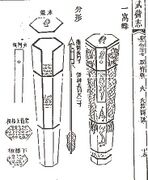 A more fact based and clear description of the bomb exists in the History of Jin: "The heaven-shaking-thunder bomb is an iron vessel filled with gunpowder. When lighted with fire and shot off, it goes off like a crash of thunder that can be heard for a hundred li [thirty miles], burning an expanse of land more than half a mu [所爇圍半畝之上, a mu is a sixth of an acre], and the fire can even penetrate iron armor."[66] A Ming official named He Mengchuan would encounter an old cache of these bombs three centuries later in the Xi'an area: "When I went on official business to Shaanxi Province, I saw on top of Xi'an's city walls an old stockpile of iron bombs. They were called 'heaven-shaking-thunder' bombs, and they were like an enclosed rice bowl with a hole at the top, just big enough to put your finger in. The troops said they hadn't been used for a very long time."[66] Furthermore, he wrote, "When the powder goes off, the bomb rips open, and the iron pieces fly in all directions. That is how it is able to kill people and horses from far away."[67]