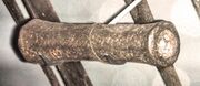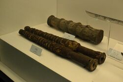 Archaeological samples of the gun, specifically the hand cannon (huochong), have been dated starting from the 13th century. The oldest extant gun whose dating is unequivocal is the Xanadu Gun because it contains an inscription describing its date of manufacture corresponding to 1298. It is so called because it was discovered in the ruins of Xanadu, the Mongol summer palace in Inner Mongolia. The Xanadu Gun is 34.7 cm in length and weighs 6.2 kg. The design of the gun includes axial holes in its rear which some speculate could have been used in a mounting mechanism. Like most early guns it is small, weighing just over six kilograms and thirty-five centimeters in length.[54] Although the Xanadu Gun is the most precisely dated gun from the 13th century, other extant samples with approximate dating likely predate it. The Heilongjiang hand cannon is dated a decade earlier to 1288, but the dating method is based on contextual evidence; the gun bears no inscription or era date.[55] According to the History of Yuan, in 1287, a group of soldiers equipped with hand cannons led by the Jurchen commander Li Ting (李庭) attacked the rebel prince Nayan's camp. The History reports that the hand cannons not only "caused great damage," but also caused "such confusion that the enemy soldiers attacked and killed each other."[56] The hand cannons were used again in the beginning of 1288. Li Ting's "gun-soldiers" or chongzu (銃卒) were able to carry the hand cannons "on their backs". The passage on the 1288 battle is also the first to coin the name chong (銃) for metal-barrel firearms. Chong was used instead of the earlier and more ambiguous term huo tong (fire tube; 火筒), which may refer to the tubes of fire lances, proto-cannons, or signal flares.[57]