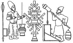 Description of the drug (mixture) to be introduced in the madfa'a (cannon) with its proportions: barud, ten; charcoal two drachmes, sulphur one and a half drachmes. Reduce the whole into a thin powder and fill with it one third of the madfa'a. Do not put more because it might explode. This is why you should go to the turner and ask him to make a wooden madfa'a whose size must be in proportion with its muzzle. Introduce the mixture (drug) strongly; add the bunduk (balls) or the arrow and put fire to the priming. The madfa'a length must be in proportion with the hole. If the madfa'a was deeper than the muzzle's width, this would be a defect. Take care of the gunners. Be careful[114]