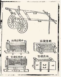 A seven barreled organ gun with two auxiliary guns by its side on a two-wheeled carriage. From the Huolongjing.