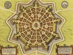 The main distinguishing features of the star fort were its angle bastions, each placed to support their neighbor with lethal crossfire, covering all angles, making them extremely difficult to engage with and attack. Angle bastions consisted of two faces and two flanks. Artillery positions positioned at the flanks could fire parallel into the opposite bastion's line of fire, thus providing two lines of cover fire against an armed assault on the wall, and preventing mining parties from finding refuge. Meanwhile, artillery positioned on the bastion platform could fire frontally from the two faces, also providing overlapping fire with the opposite bastion.[205] Overlapping mutually supporting defensive fire was the greatest advantage enjoyed by the star fort. As a result, sieges lasted longer and became more difficult affairs. By the 1530s the bastion fort had become the dominant defensive structure in Italy.[206]