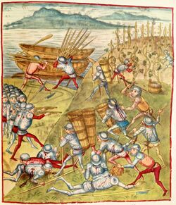 The 1320s seem to have been the takeoff point for guns in Europe according to most modern military historians. Scholars suggest that the lack of gunpowder weapons in a well-traveled Venetian's catalogue for a new crusade in 1321 implies that guns were unknown in Europe up until this point.[100] From the 1320s guns spread rapidly across Europe. The French raiding party that sacked and burned Southampton in 1338 brought with them a ribaudequin and 48 bolts (but only 3 pounds of gunpowder).[143] By 1341 the town of Lille had a "tonnoire master," and a tonnoire was an arrow-hurling gun. In 1345, two iron cannons were present in Toulouse. In 1346 Aix-la-Chapelle too possessed iron cannons which shot arrows (busa ferrea ad sagittandum tonitrum).[144] The Battle of Crécy in 1346 was one of the first in Europe where cannons were used.[145] By 1350 Petrarch wrote that the presence of cannons on the battlefield was 'as common and familiar as other kinds of arms'.[146]