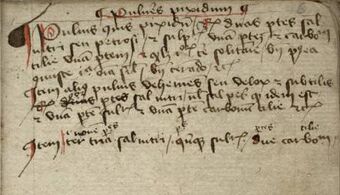 The oldest written recipes for gunpowder in Europe were recorded under the name Marcus Graecus or Mark the Greek between 1280 and 1300 in the Liber Ignium, or Book of Fires.[136] One recipe for "flying fire" (ignis volatilis) involves saltpeter, sulfur, and colophonium, which, when inserted into a reed or hollow wood, "flies away suddenly and burns up everything." Another recipe, for artificial "thunder", specifies a mixture of one pound native sulfur, two pounds linden or willow charcoal, and six pounds of saltpeter. Another specifies a 1:3:9 ratio.[137] The text is likely a translation from Arabic through a Spanish intermediary due to the terminology used and recipes for items found in 12th century Arabic texts.[138]