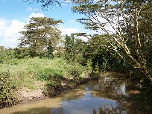 The park's northern, eastern, and western boundaries are enclosed by an electric fence in order to keep the wildlife from roaming into the city. Its southern boundary is formed by the Mbagathi River. This boundary is not fenced and is open to the Kitengela Conservation Area which is located immediately south of the park, and the Athi-Kapiti plains.[4] There is considerable movement of large ungulate species across this boundary.