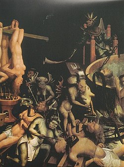 Peace, compassion and forgiveness of wrongs done by others are key elements of Christian teaching.[91] However, Christians have struggled since the days of the Church fathers with the question of when the use of force is justified.[92] Such debates have led to concepts such as just war theory. Throughout history, biblical passages have been used to justify the use of force against heretics,[93] sinners[94] and external enemies.[95] Heitman and Hagan identify the Inquisitions, Crusades, wars of religion and antisemitism as being "among the most notorious examples of Christian violence".[96] To this list, J. Denny Weaver adds, "warrior popes, support for capital punishment, corporal punishment under the guise of 'spare the rod and spoil the child', justifications of slavery, world-wide colonialism in the name of conversion to Christianity, the systemic violence of women subjected to men". Weaver employs a broader definition of violence that extends the meaning of the word to cover "harm or damage", not just physical violence per se. Thus, under his definition, Christian violence includes "forms of systemic violence such as poverty, racism, and sexism".[97]