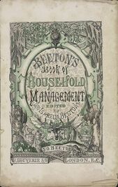 Acton's work was an important influence on Isabella Beeton,[18] who published Mrs Beeton's Book of Household Management in 24 monthly parts between 1857 and 1861. This was a guide to running a Victorian household, with advice on fashion, child care, animal husbandry, poisons, the management of servants, science, religion, and industrialism.[19][20] Of the 1,112 pages, over 900 contained recipes. Most were illustrated with coloured engravings. It is said that many of the recipes were plagiarised from earlier writers such as Acton, but the Beetons never claimed that the book's contents were original. It was intended as a reliable guide for the aspirant middle classes.