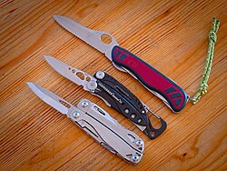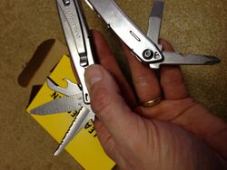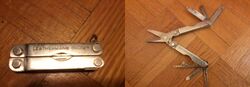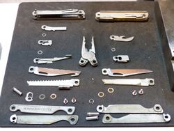 Leatherman currently produces folding knives under the Crater name. Models range from two tools (knife blade and carabiner/bottle opener) to four (blade, carabiner/bottle opener, flat, and Phillips screwdrivers).