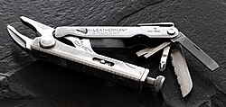 Leatherman's primary products are multi-tools and knives. Most Leatherman multi-tools are built around a pair of pliers, with up to 21 additional tools stored in the handles, including knives (straight and serrated blades), screwdrivers (flat, Phillips), saws, wire cutters and strippers, electrical crimper, bottle opener, and can opener. Most models have a built-in safety mechanism that locks the active tool in the open position when fully unfolded. Models range in weight from the 0.81 ounce (23 g) Style to the 12.5 ounce (335 g) Surge.