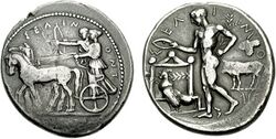 The seal of LSHTM is based on a coin from the archeological site Selinus, Sicily struck in 466 BC. It was designed by the sculptor and medallist Allan Gairdner Wyon. It shows two Greek gods associated with health – Apollo, the god of prophecy, music and medicine, and his sister Artemis, goddess of hunting and chastity, and comforter of women in childbirth – in a horse-drawn chariot. Artemis is driving while her brother the great archer is shooting arrows. The fruitful date palm was added to indicate the tropical activities of the school but also has a close connection with Apollo and Artemis: when their mother Leto gave birth to them on the island of Delos, miraculously a palm sprang up to give her shade in childbirth.[citation needed]