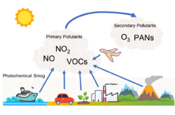 Photochemical smog, often referred to as "summer smog", is the chemical reaction of sunlight, nitrogen oxides and volatile organic compounds in the atmosphere, which leaves airborne particles and ground-level ozone.[21] Photochemical smog depends on primary pollutants as well as the formation of secondary pollutants. These primary pollutants include nitrogen oxides, particularly nitric oxide (NO) and nitrogen dioxide (NO2), and volatile organic compounds. The relevant secondary pollutants include peroxylacyl nitrates (PAN), tropospheric ozone, and aldehydes. An important secondary pollutant for photochemical smog is ozone, which is formed when hydrocarbons (HC) and nitrogen oxides (NOx) combine in the presence of sunlight; nitrogen dioxide (NO2), which is formed as nitric oxide (NO) combines with oxygen (O2) in the air.[22] In addition, when SO2 and NOx are emitted they eventually are oxidized in the troposphere to nitric acid and sulfuric acid, which, when mixed with water, form the main components of acid rain.[23] All of these harsh chemicals are usually highly reactive and oxidizing. Photochemical smog is therefore considered to be a problem of modern industrialization. It is present in all modern cities, but it is more common in cities with sunny, warm, dry climates and a large number of motor vehicles.[24] Because it travels with the wind, it can affect sparsely populated areas as well.