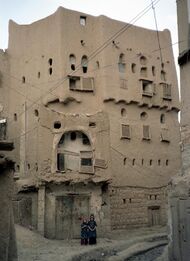 Mud can be made into mud bricks, also called adobe, by mixing mud with water, placing the mixture into moulds and then allowing it to dry in open air.[2] Straw is sometimes used as a binder within the bricks, as it makes them a composite. When the brick would otherwise break, the straw will redistribute the force throughout the brick, decreasing the chance of breakage.[3] Such buildings must be protected from groundwater, usually by building upon a masonry, fired brick, rock or rubble foundation, and also from wind-driven rain in damp climates, usually by deep roof overhangs. In extremely dry climates a well-drained flat roof may be protected with a well-prepared (puddled) and properly maintained dried mud coating, viable as the mud will expand when moistened and so become more water resistant.[4] Adobe mudbricks were commonly used by the Pueblo Indians to build their homes and other necessary structures. In some countries there are entire cities made of mud brick houses. Cow dung and biomass are added to regulate indoor climate.[5]