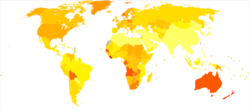 In the US in 2008, 59,695 people were diagnosed with melanoma, and 8,623 people died from it.[72] In Australia more than 12,500 new cases of melanoma are reported each year, out of which more than 1,500 die from the disease. Australia has the highest per capita incidence of melanoma in the world.[73]