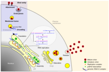 Positive-strand RNA viruses have genetic material that can function both as a genome and as messenger RNA; it can be directly translated into protein in the host cell by host ribosomes.[8] The first proteins to be expressed after infection serve genome replication functions; they recruit the positive-strand viral genome to viral replication complexes formed in association with intracellular membranes. These complexes contain proteins of both viral and host cell origin, and may be associated with the membranes of a variety of organelles—often the rough endoplasmic reticulum, but also including membranes derived from mitochondria, vacuoles, the Golgi apparatus, chloroplasts, peroxisomes, plasma membranes, autophagosomal membranes, and novel cytoplasmic compartments.[4]