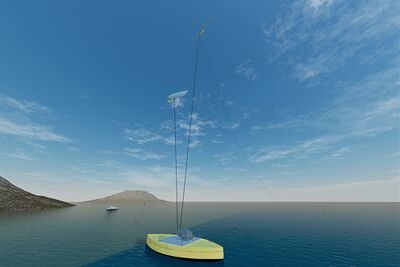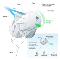 For instance, a system of tethered kites[23] could capture energy from high-altitude winds. Another concept uses a helium balloon with attached sails to generate pressure and drive rotation around a horizontal axis. Circular motion of ropes transfer kinetic energy to ground-based generator.[24]