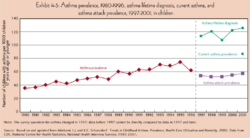 - ↑ "Is the prevalence of asthma declining? Systematic review of epidemiological studies". Allergy 65 (2): 152–67. February 2010. doi:10.1111/j.1398-9995.2009.02244.x. PMID 19912154.