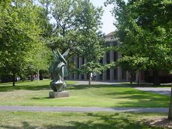 In 1969, Centre celebrated the college's sesquicentennial year by dedicating and installing, at the center of campus, the Flame—a large sculpture that symbolically represents the torch of knowledge that appears on Centre's official seal. A plaque at the base of the statue quotes Johann Wolfgang Von Goethe: "Where the light is brightest, the shadows are deepest."[81] The statue quickly became an ode to the liberation of the body as well as the mind. By the early 1970s, students began spontaneously running naked to and from dorms and Greek houses while passing the Flame. "Running the Flame" is now enshrined as a tradition that some Centre students complete prior to graduation.[82]