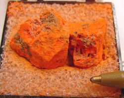 Natural minium is uncommon, forming only in extreme oxidizing conditions of lead ore bodies. The best known natural specimens come from Broken Hill, New South Wales, Australia, where they formed as the result of a mine fire.[6]