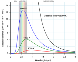In 1860 Gustav Kirchhoff proposed the idea of a black body, a material that emits electromagnetic radiation at all wavelengths.[21][22] In 1894 Wilhelm Wien derived an expression relating the temperature (T) of a black body to its peak emission wavelength (λmax):[23]