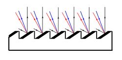 The resolution of a prism is limited by its size; a larger prism will provide a more detailed spectrum, but the increase in mass makes it unsuitable for highly detailed work.[6] This issue was resolved in the early 1900s with the development of high-quality reflection gratings by J.S. Plaskett at the Dominion Observatory in Ottawa, Canada.[5]:11 Light striking a mirror will reflect at the same angle, however a small portion of the light will be refracted at a different angle; this is dependent upon the indices of refraction of the materials and the wavelength of the light.[7] By creating a "blazed" grating which utilizes a large number of parallel mirrors, the small portion of light can be focused and visualized. These new spectroscopes were more detailed than a prism, required less light, and could be focused on a specific region of the spectrum by tilting the grating.[6]