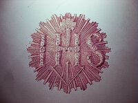 Devotion to and veneration of the IHS monogram, derived from the Greek word for Jesus, ΙΗΣΟΥΣ (and sometimes erroneously interpreted[13] as Iesus Hominum Salvator, Jesus saviour of mankind), also dates back to the early days of Christianity, where it was placed on altars and religious vestments, ornaments and other objects.[3] The IHS monogram is also found on a gold coin from the eighth century.[4]