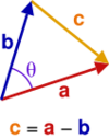 Given two vectors [math]\displaystyle{ {\color{red}\mathbf{a}} }[/math] and [math]\displaystyle{ {\color{blue}\mathbf{b}} }[/math] separated by angle [math]\displaystyle{ \theta }[/math] (see image right), they form a triangle with a third side [math]\displaystyle{ {\color{orange}\mathbf{c}} = {\color{red}\mathbf{a}} - {\color{blue}\mathbf{b}} }[/math]. Let [math]\displaystyle{ a }[/math], [math]\displaystyle{ b }[/math] and [math]\displaystyle{ c }[/math] denote the lengths of [math]\displaystyle{ {\color{red}\mathbf{a}} }[/math], [math]\displaystyle{ {\color{blue}\mathbf{b}} }[/math], and [math]\displaystyle{ {\color{orange}\mathbf{c}} }[/math], respectively. The dot product of this with itself is: