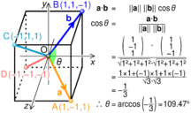 In Euclidean space, a Euclidean vector is a geometric object that possesses both a magnitude and a direction. A vector can be pictured as an arrow. Its magnitude is its length, and its direction is the direction to which the arrow points. The magnitude of a vector [math]\displaystyle{ \mathbf{a} }[/math] is denoted by [math]\displaystyle{ \left\| \mathbf{a} \right\| }[/math]. The dot product of two Euclidean vectors [math]\displaystyle{ \mathbf{a} }[/math] and [math]\displaystyle{ \mathbf{b} }[/math] is defined by[3][4][1] [math]\displaystyle{ \mathbf{a}\cdot\mathbf{b}= \left\|\mathbf{a}\right\| \left\|\mathbf{b}\right\|\cos\theta , }[/math] where [math]\displaystyle{ \theta }[/math] is the angle between [math]\displaystyle{ \mathbf{a} }[/math] and [math]\displaystyle{ \mathbf{b} }[/math].