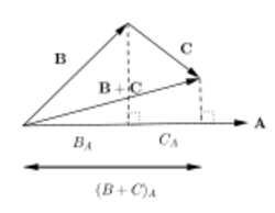 The scalar projection (or scalar component) of a Euclidean vector [math]\displaystyle{ \mathbf{a} }[/math] in the direction of a Euclidean vector [math]\displaystyle{ \mathbf{b} }[/math] is given by [math]\displaystyle{ a_b = \left\| \mathbf a \right\| \cos \theta , }[/math] where [math]\displaystyle{ \theta }[/math] is the angle between [math]\displaystyle{ \mathbf{a} }[/math] and [math]\displaystyle{ \mathbf{b} }[/math].