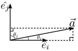 Also, by the geometric definition, for any vector [math]\displaystyle{ \mathbf{e}_i }[/math] and a vector [math]\displaystyle{ \mathbf{a} }[/math], we note that [math]\displaystyle{ \mathbf a \cdot \mathbf e_i = \left\| \mathbf a \right\| \, \left\| \mathbf e_i \right\| \cos \theta_i = \left\| \mathbf a \right\| \cos \theta_i = a_i , }[/math] where [math]\displaystyle{ a_i }[/math] is the component of vector [math]\displaystyle{ \mathbf{a} }[/math] in the direction of [math]\displaystyle{ \mathbf{e}_i }[/math]. The last step in the equality can be seen from the figure.