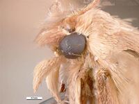 Adult African sugar-cane borers are relatively small with a 3mm abdomen width.[6] They have a wingspan of 35mm. The forewings are pale brown with two distinct dark brown spots in the center. The hindwings are a whitish brown and contain short fringes and brown longitudinal veins.[7] Both male and female African sugar-cane borers share the same appearance, but females are slightly larger.[8] When resting, E. saccharina folds its wings over its abdomen so that its fore wings are parallel to and cover the white hindwings.[7]