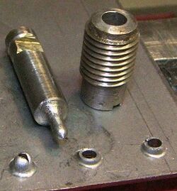 Usually, the punch and die are close to the same dimensions, creating a sheared edge when they meet. A punch that is significantly smaller than the die can be used to produce an extruded hole where the punch displaces the punched material to the sides, forming a tube perpendicular to the punched sheet.[2][3]