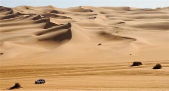 Many people think of deserts as consisting of extensive areas of billowing sand dunes because that is the way they are often depicted on TV and in films,[55] but deserts do not always look like this.[56] Across the world, around 20% of desert is sand, varying from only 2% in North America to 30% in Australia and over 45% in Central Asia.[20] Where sand does occur, it is usually in large quantities in the form of sand sheets or extensive areas of dunes.[20]