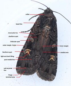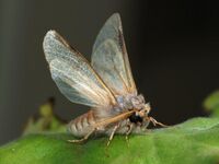 An adult male pine processionary moth (Thaumetopoea pityocampa). This species is a serious forest pest when in its larval state. Notice the bristle springing from the underside of the hindwing (frenulum) and running forward to be held in a small catch of the forewing, whose function is to link the wings together.
