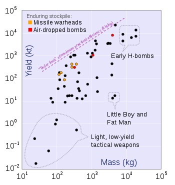 The yield-to-mass ratio is the amount of weapon yield compared to the mass of the weapon. According to nuclear-weapons designer Ted Taylor, the practical maximum yield-to-mass ratio for fusion weapons is about 6 megatonnes of TNT per tonne (25 TJ/kg).[11][self-published source?] The "Taylor limit" is not derived from first principles, and weapons with yields as high as 9.5 megatonnes per tonne have been theorized.[12] The highest achieved values are somewhat lower, and the value tends to be lower for smaller, lighter weapons, of the sort that are emphasized in today's arsenals, designed for efficient MIRV use or delivery by cruise missile systems.