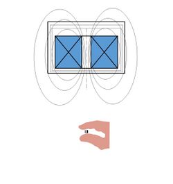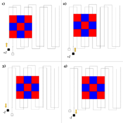 The basic system for 1DOF movement consists of two serpentine traces, individually actuated.[30][31] Figure shows the schematic of the trace paths and a 3x3 magnet microrobot on top. On position number 1, the magnets are in their equilibrium position where the magnetic flux density is the highest, in between two opposite currents from the same trace path.