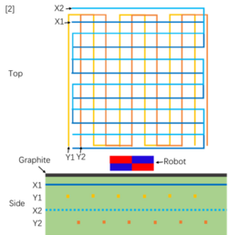 The driving platform PCB was built with multiple layers of wire traces like a voice coil actuation. Shown in figure [1] there are four layers of wires in the PCB board which represents two sets placed perpendicular to each other that stand for X and Y direction movement. From top to bottom, the order comes in XYXY that cross each other evenly and same axis were interlaced to control actuation. Since the force created by every layer must be the same on the circuit, deeper layers need higher current to transmit the same magnetic force to the robots on top. Set of currents with 0.25A, 0.33A, 0.5A, and 0.7A were used at SRI.[26] One square of the above 4-layer system acts as a zone on the driving platform.[27] This enables the circuit to control multiple robots in the same zone easily, but each robot cannot move separately. However, the platform can be divided into multiple zones which enable the separate control of robots in different zones.