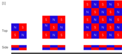 Microrobot involving magnetic levitation has been studied by SRI International (Stanford Research Institute) for many years.[25] This small-scale multi-agent robotic system is called the Diamagnetic Micro Manipulation or the DM3 system.[26][27][28] The DM3 contains a microrobot built with magnets that levitate and move on the surface of a PCB driving platform. The microrobot in this system was built with an array of NdFeB magnets shown in figure File:Microrobot Magnet Disposition.png. The dimension of magnets varies between different versions, while typically in the range of 1.4[27]-2[26] mm square shape with a lower height. The poles of magnets were positioned as a checkerboard array to fit the magnetic field generated by the PCB platform. The robot can be built in different size depending on the size of the array. Prototypes tested in SRI papers are mainly 2*2,[26][27][29] 3*3,[27] and 5*5[29] squares.
