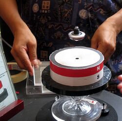 Dynamic stability on the other hand, can be achieved by spinning a permanent magnet having poles slightly off the rotation plane (called tilt) in constant speed within a range which can hold another dipole magnet in the air.[6][7]