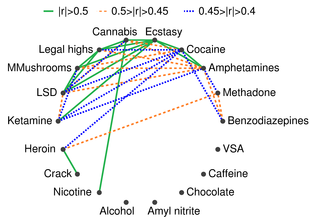Second, the word "abuse" implies a recognized standard of use for any substance. Drinking an occasional glass of wine is considered acceptable in most Western countries, while drinking several bottles is seen as abuse. Strict temperance advocates, who may or may not be religiously motivated, would see drinking even one glass as abuse. Some groups (Mormons, as prescribed in "the Word of Wisdom") even condemn caffeine use in any quantity. Similarly, adopting the view that any (recreational) use of cannabis or substituted amphetamines constitutes drug abuse implies a decision made that the substance is harmful, even in minute quantities.[29] In the U.S., drugs have been legally classified into five categories, schedule I, II, III, IV, or V in the Controlled Substances Act. The drugs are classified on their deemed potential for abuse. The usage of some drugs is strongly correlated.[30] For example, the consumption of seven illicit drugs (amphetamines, cannabis, cocaine, ecstasy, legal highs, LSD, and magic mushrooms) is correlated and the Pearson correlation coefficient r>0.4 in every pair of them; consumption of cannabis is strongly correlated (r>0.5) with the usage of nicotine (tobacco), heroin is correlated with cocaine (r>0.4) and methadone (r>0.45), and is strongly correlated with crack (r>0.5)[30]
