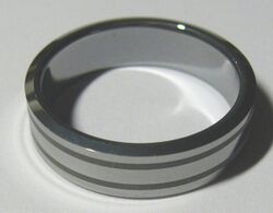 The jewelry industry makes rings of sintered tungsten carbide, tungsten carbide/metal composites, and also metallic tungsten.[70] WC/metal composite rings use nickel as the metal matrix in place of cobalt because it takes a higher luster when polished. Sometimes manufacturers or retailers refer to tungsten carbide as a metal, but it is a ceramic.[71] Because of tungsten carbide's hardness, rings made of this material are extremely abrasion resistant, and will hold a burnished finish longer than rings made of metallic tungsten. Tungsten carbide rings are brittle, however, and may crack under a sharp blow.[72]