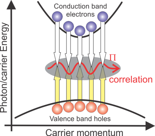 that describes a correlated emission of a photon [math]\displaystyle{ (\hat{B}^\dagger_\omega) }[/math] when an electron with wave vector [math]\displaystyle{ \mathbf{k} }[/math] recombines with a hole, i.e., an electronic vacancy. Here, [math]\displaystyle{ \hat{P}_\mathbf{k} }[/math] determines the corresponding electron–hole recombination operator defining also the microscopic polarization within semiconductor. Therefore, [math]\displaystyle{ \Pi_{\mathbf{k},\omega} }[/math] can also be viewed as photon-assisted polarization.