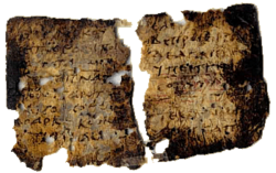 Two uncial fragments containing Greek text of the Didache (verses 1:3c–4a; 2:7–3:2) were found among the Oxyrhynchus Papyri (no. 1782) and are now in the collection of the Bodleian Art, Archaeology and Ancient World Library in Oxford.[13][14][15] Apart from these fragments, the Greek text of the Didache has only survived in a single manuscript, the Codex Hierosolymitanus. Dating the document is thus made difficult both by the lack of hard evidence and its composite character. The Didache may have been compiled in its present form as late as 150, although a date closer to the end of the first century seems more probable to many.[16]