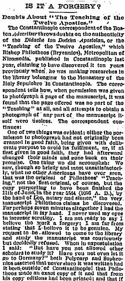 The text was lost, but scholars knew of it through the writing of later church fathers, some of whom had drawn heavily on it.[19] In 1873 in Istanbul, metropolitan Philotheos Bryennios found a Greek copy of the Didache, written in 1056, and he published it in 1883.[19] Hitchcock and Brown produced the first English translation in March 1884. Adolf von Harnack produced the first German translation in 1884, and Paul Sabatier produced the first French translation and commentary in 1885.[20]