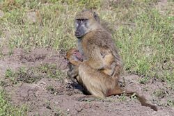 Female Chacma baboon (Papio ursinus griseipes) with infant (Botswana)