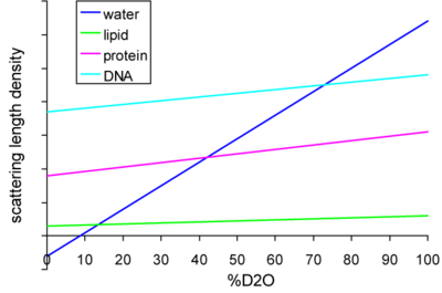 The technique of contrast variation (or contrast matching) relies on the differential scatter of hydrogen vs. deuterium. Figure 1 shows the scattering length density for water and various biological macromolecules as a function of the deuterium concentration. (Adapted from.[2]) Biological samples are usually dissolved in water, so their hydrogens are able to exchange with any deuteriums in the solvent. Since the overall scatter of a molecule depends on the scatter of all its components, this will depend on the ratio of hydrogen to deuterium in the molecule. At certain ratios of H2O to D2O, called match points, the scatter from the molecule will equal that of the solvent, and thus be eliminated when the scatter from the buffer is subtracted from the data. For instance the match point for proteins is typically around 40–45% D2O, and at that concentration the scatter from the protein will be indistinguishable from that of the buffer.