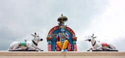 In Puranas, which are part of the Hindu texts, the earth-goddess Prithvi was in the form of a cow, successively milked of beneficent substances for the benefit of humans, by deities starting with the first sovereign: Prithu milked the cow to generate crops for humans to end a famine.[25] Kamadhenu, the miraculous "cow of plenty" and the "mother of cows" in certain versions of the Hindu mythology, is believed to represent the generic sacred cow, regarded as the source of all prosperity.[26] In the 19th century, a form of Kamadhenu was depicted in poster-art that depicted all major gods and goddesses in it.[27][28] Govatsa Dwadashi which marks the first day of Diwali celebrations, is the main festival connected to the veneration and worship of cows as chief source of livelihood and religious sanctity in India, wherein the symbolism of motherhood is most apparent with the sacred cows Kamadhenu and her daughter Nandini.[29]
